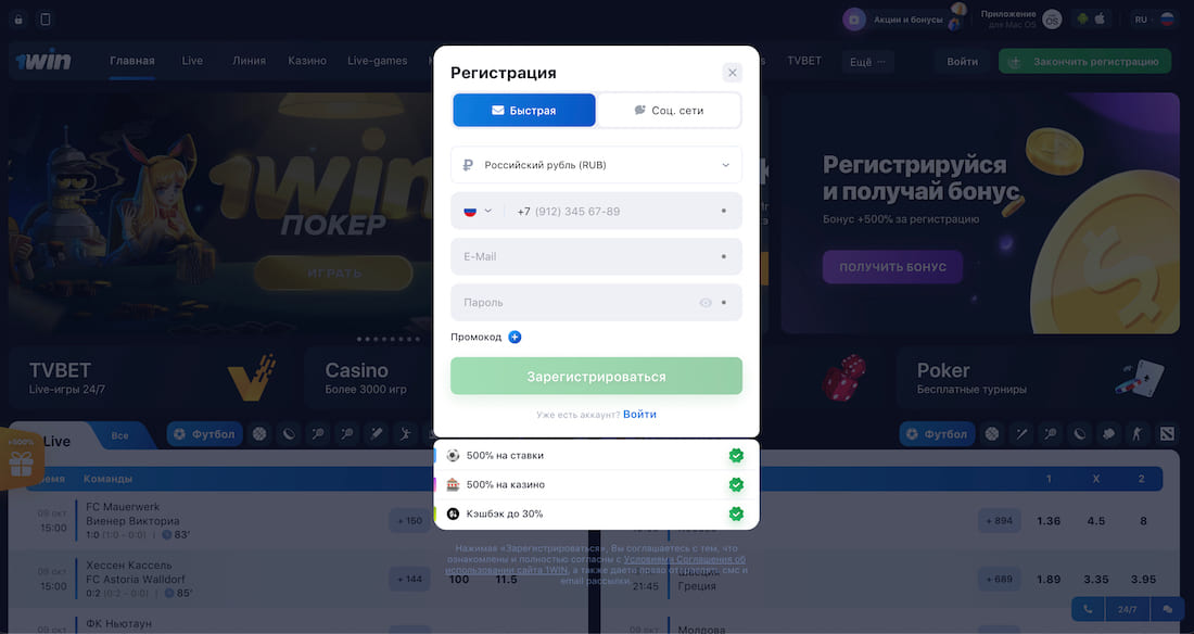 Регистрация также дает возможность использовать промокод, чтобы получить увеличенный бонус за регистрацию или другие привилегии. Перед завершением регистрации необходимо подтвердить согласие с условиями пользовательского соглашения 1Вин, поставив соответствующую отметку.